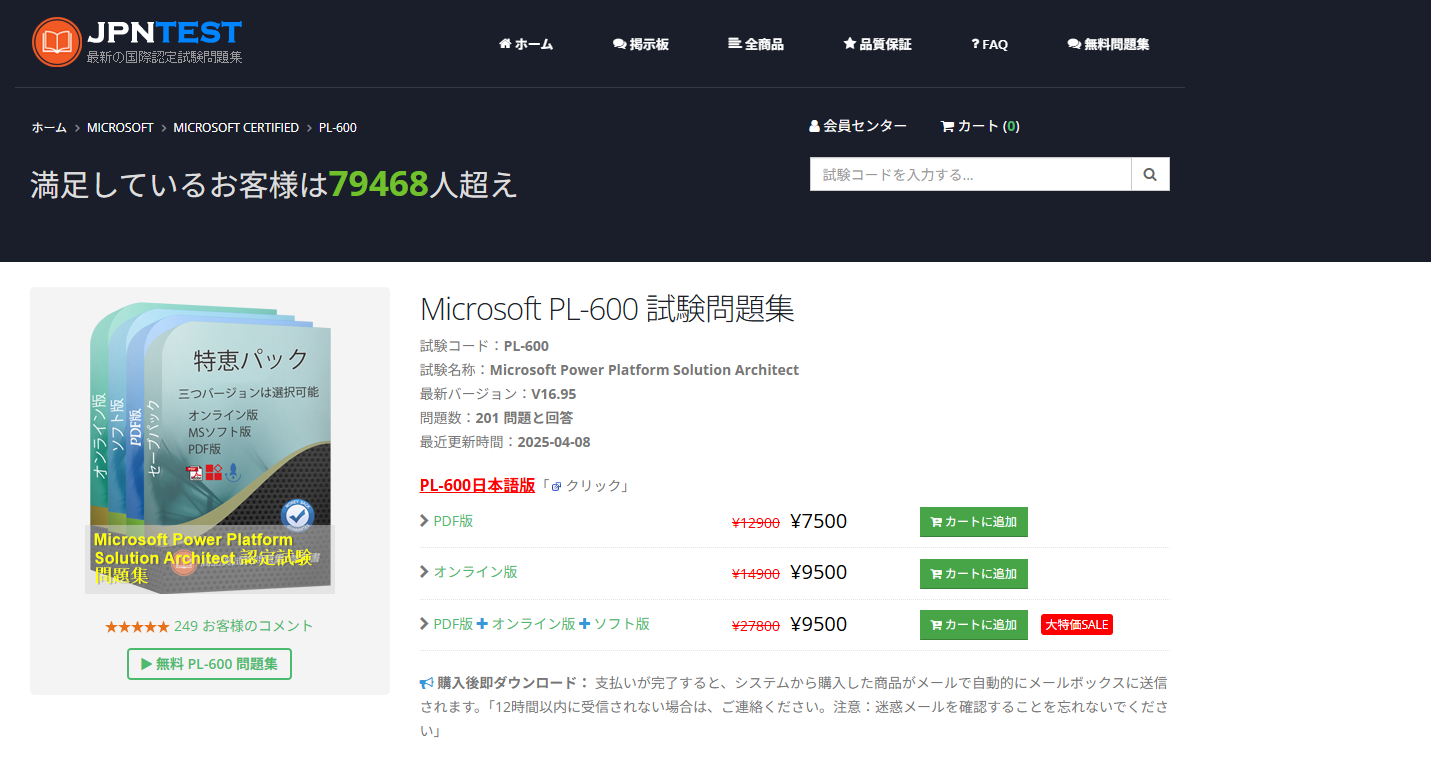 JPNTESTという過去問を販売しているサイトの問題集が、最も役立ちました。このサイトの問題は本番試験と同じものが多く含まれており、これらをしっかり理解して覚えてしまえば合格に直結します。特に難易度の高いケーススタディ問題が本番とほぼ同じ形式で出題されるため、事前に解き方を理解しておくことで大きなアドバンテージになりました。一見、怪しいサイトに見えますが、ちゃんとしたサイトです。PL200、PL400でもお世話になっているサイトです。